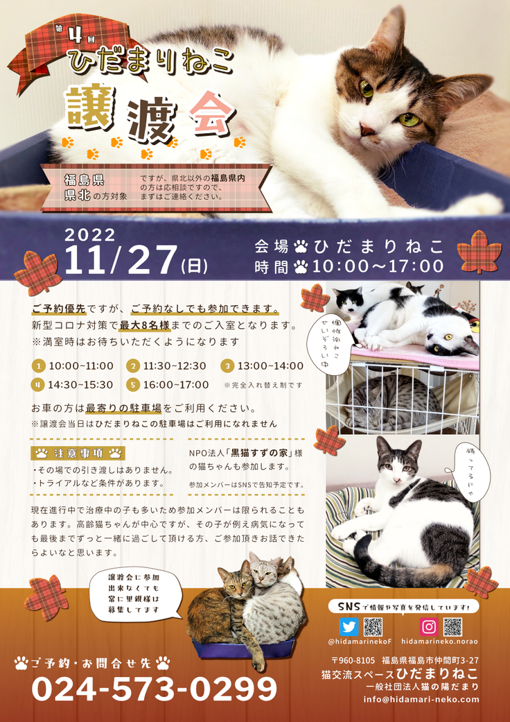 なお、今回もNPO法人黒猫すずの家様の猫も参加されます。できるだけ多くのずっとのおうちが見つかりますように願うばかりです。