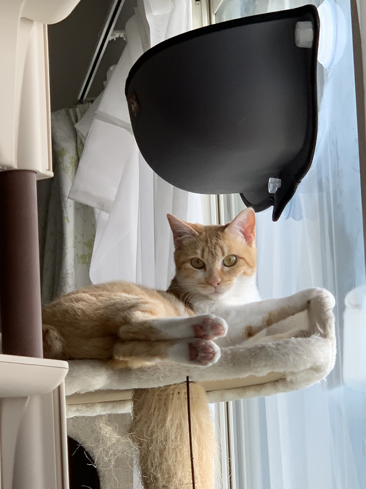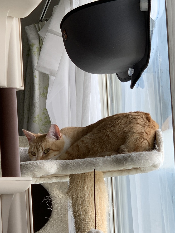 ルルは見慣れない掃除用具があるため、猫タワーの上で警戒中。