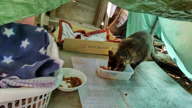 周りの廃材を片付けて少しスペースを作り、テントを張ってエサやりしています