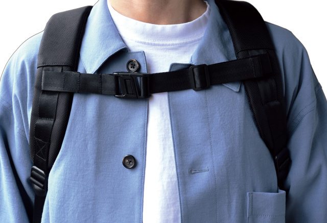 ショルダーハーネスを胸で固定するチェストストラップを装着。 歩行中でもデイバッグがブレたりズリ落ちることなく、快適に移動できる。※取り外し可能パーツ。