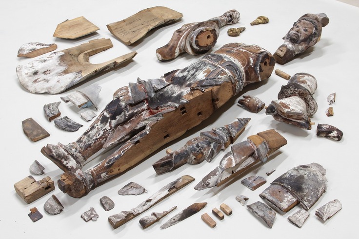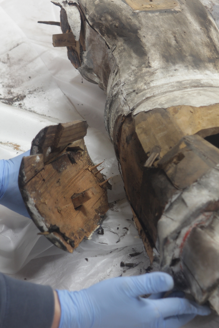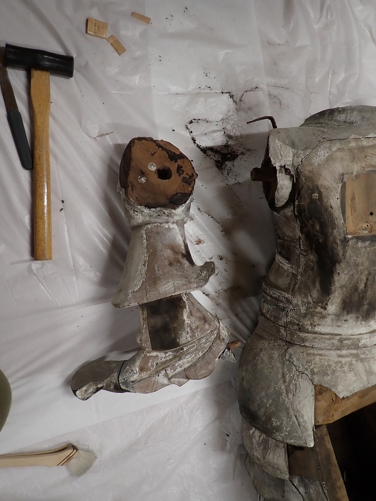 解体の結果、持国天像の構造が分かってきました。肩から足までの大部分を一本の木から彫り出し、彫刻面の不足する箇所にはその都度小さな材を取り付けています。まるで本当に甲冑のパーツを身に着けているかのようです。