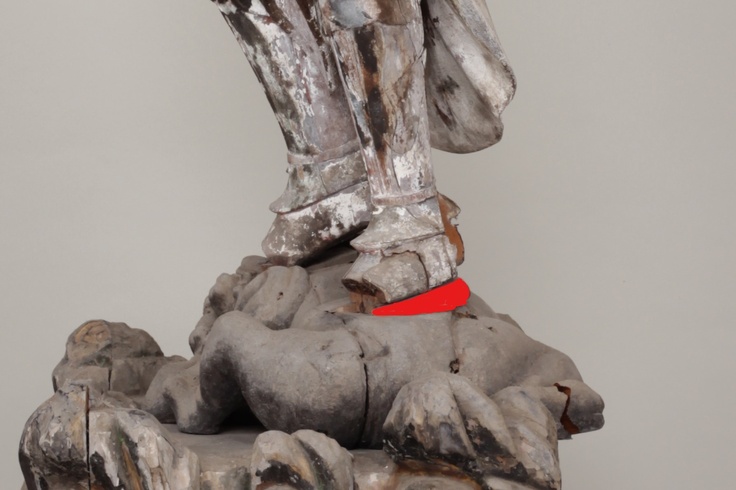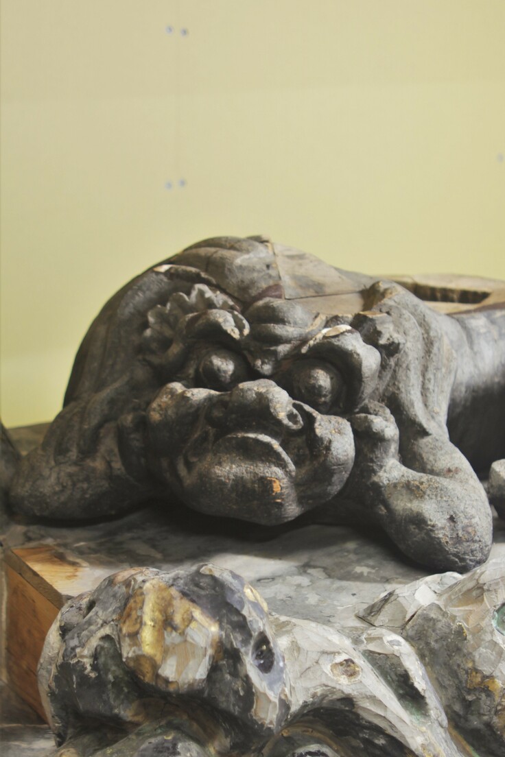 持国天は仏法を侵す「邪鬼」を踏み付けて立っています。一般に仏像の足にはホゾという部材があり、これが台座(邪鬼)の穴に挿入され安定した自立が可能となります。仏法の敵であり、像を支える要の構造でもある邪鬼。その相反する二面性も魅力です。