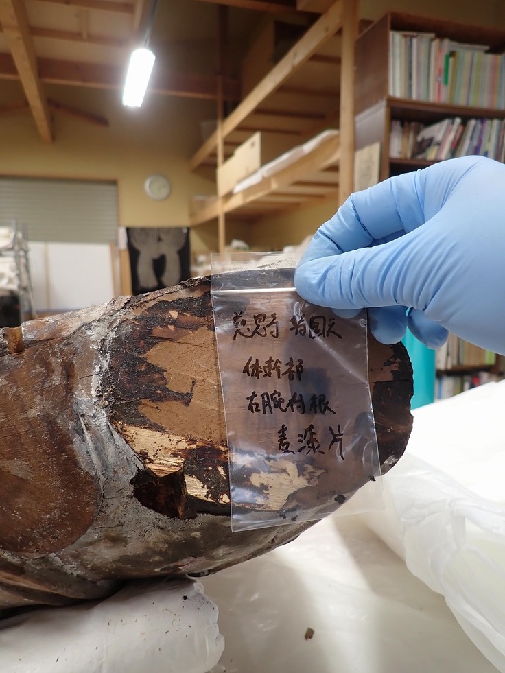墨書銘により制作年代が確認できる持国天ですが、さらに本体から微量のサンプルを採取し、放射線炭素年代測定を行いました。結果、墨書銘とほぼ同じ年代に伐採された木材、漆が使用されていることが分かりました。墨書銘の信用性も裏付けられたわけです。