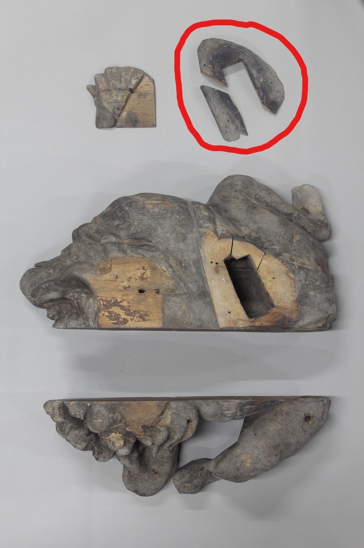 ところがこの邪鬼、持国天の左脚を受ける枘孔付近に、前方に向けて大きく傾斜するクサビ状の部材を仕込んでいます。後世の処置によるものですが、どうやらこれが例の大きな前傾姿勢に関与しているようです。