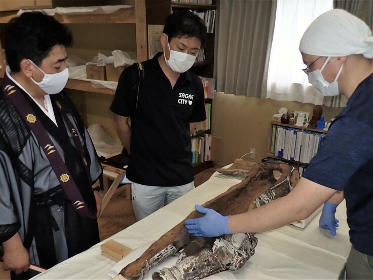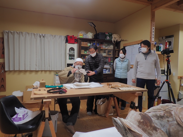 作業期間中、慈恩寺管長、寒河江市教育委員会担当の方が作業の進捗状況の確認に来てくれました。修理経過、現状、分かったこと、今後の方針などについて話し合い、情報を共有します。