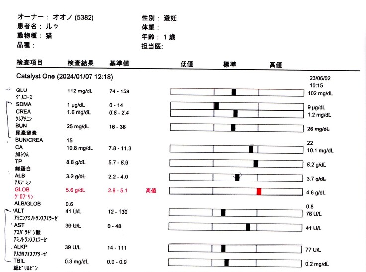 こちらの検査結果をD病院の先生に電話で伝えたところ、とりあえず今は元気も食欲もあるので様子見でいいとのことでした。数値に一喜一憂せず普段の様子に変化があったり、2か月後などの血液検査でまたグロブリンの数値が上がってきたら、治療を考えましょうというお話でした。