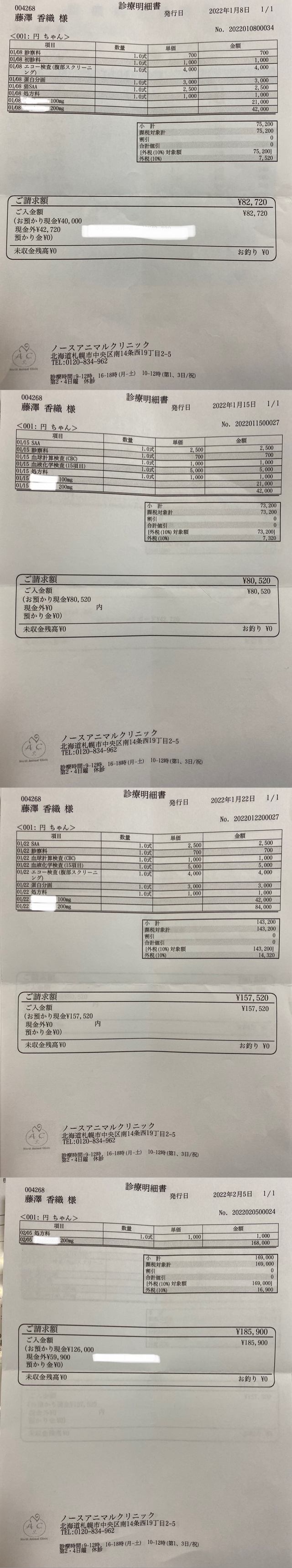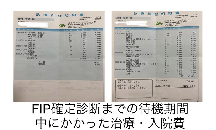 加えてFIP治療待機期間にかかった費用、治療中の通院で必要な診察、処置、検査等々でかかる費用も重なり、私の所得のみでは資金を工面することがままならず、自らの無力さを痛感致しました。