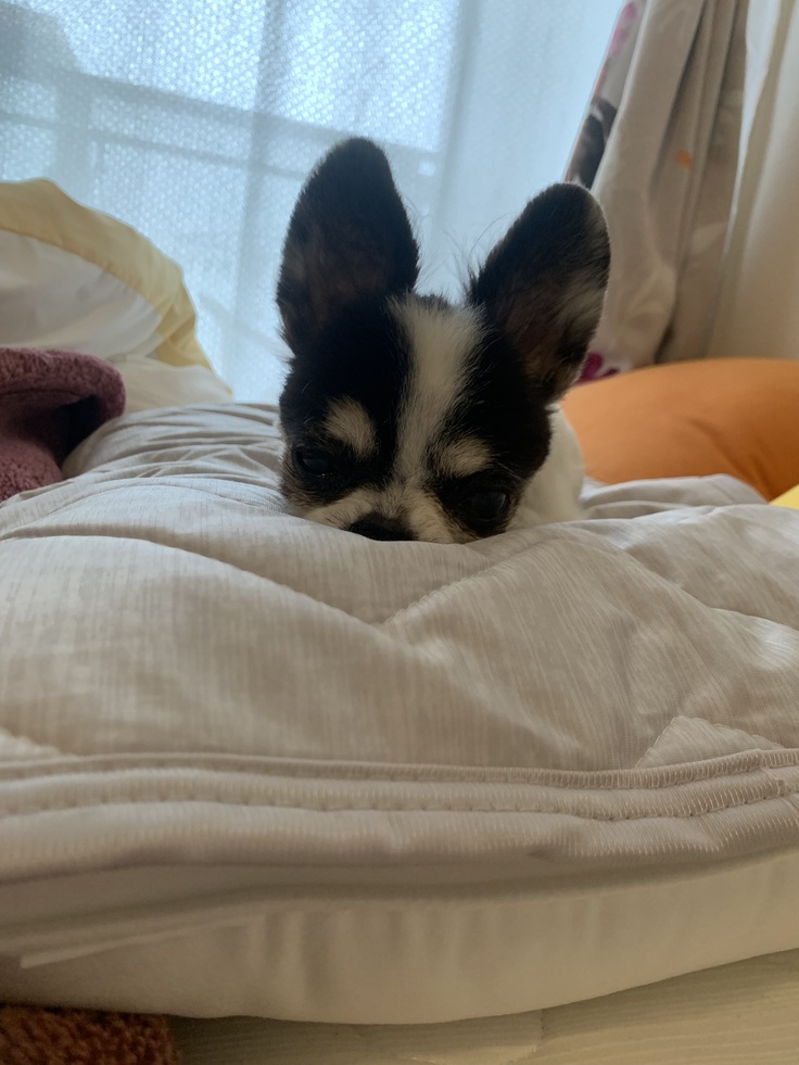 金曜日の嘔吐下痢により枕がダメになってしまったので買い替えたんですが、新品の弾力にウットリしているチップです🐶💓