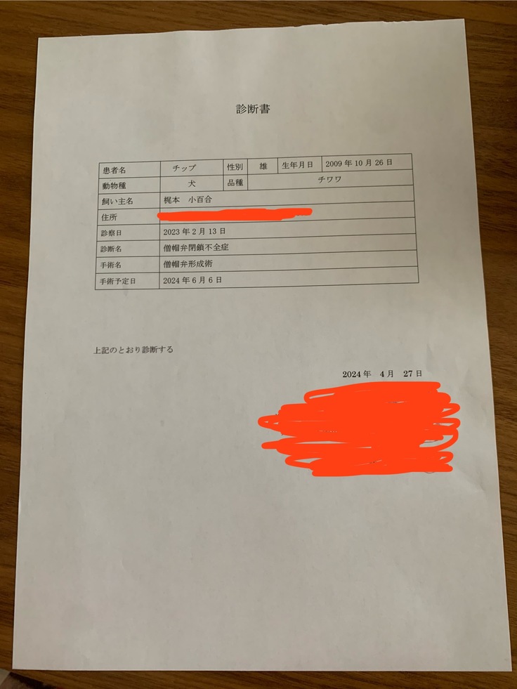 (This all started two years ago during the winter. A cardiac murmur was confirmed for the first time at our family hospital. From there, he started coughing more and more, and because the coughing continued, he was diagnosed with “collapsed bronchus” at the respiratory department of a large hospital (they said it could not be cured by surgery).As a result of regular visits to see if the cough he is getting now is coming from his heart or his bronchial tubes at a respiratory hospital and a cardiac hospital, It was diagnosed this time that his heart condition has worsened and surgery is necessary.)