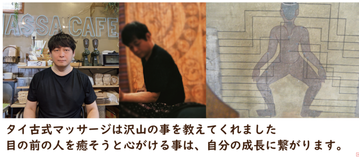 オーナーである私は幼少期に身体が弱く、中学校時代は約半年間学校に通えなかった事もあります。そのような経験もあり、凝りを解消するのみでなく本来の健康な身体を求める「タイ古式マッサージ」の考え方に共感し、この世界にハマりました。