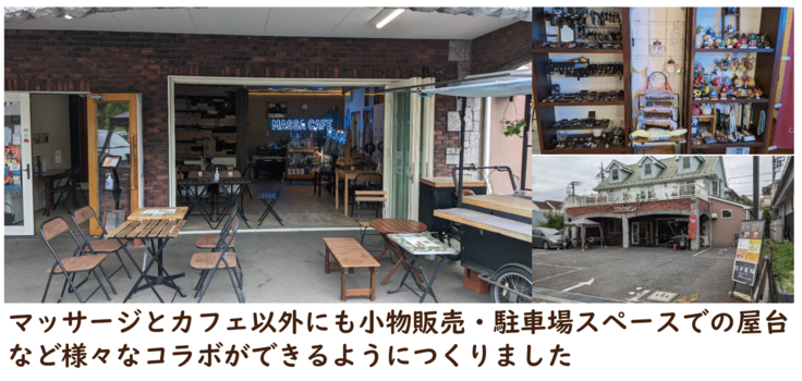 マッサージの他にも、BAR・小物販売・駐車場スペースで屋台販売も出来ます(コラボの間口を広くすることで、様々な事情の人が参加できます)