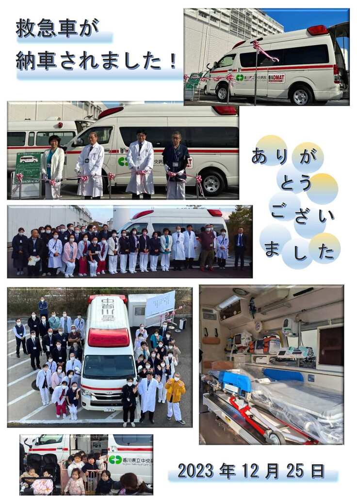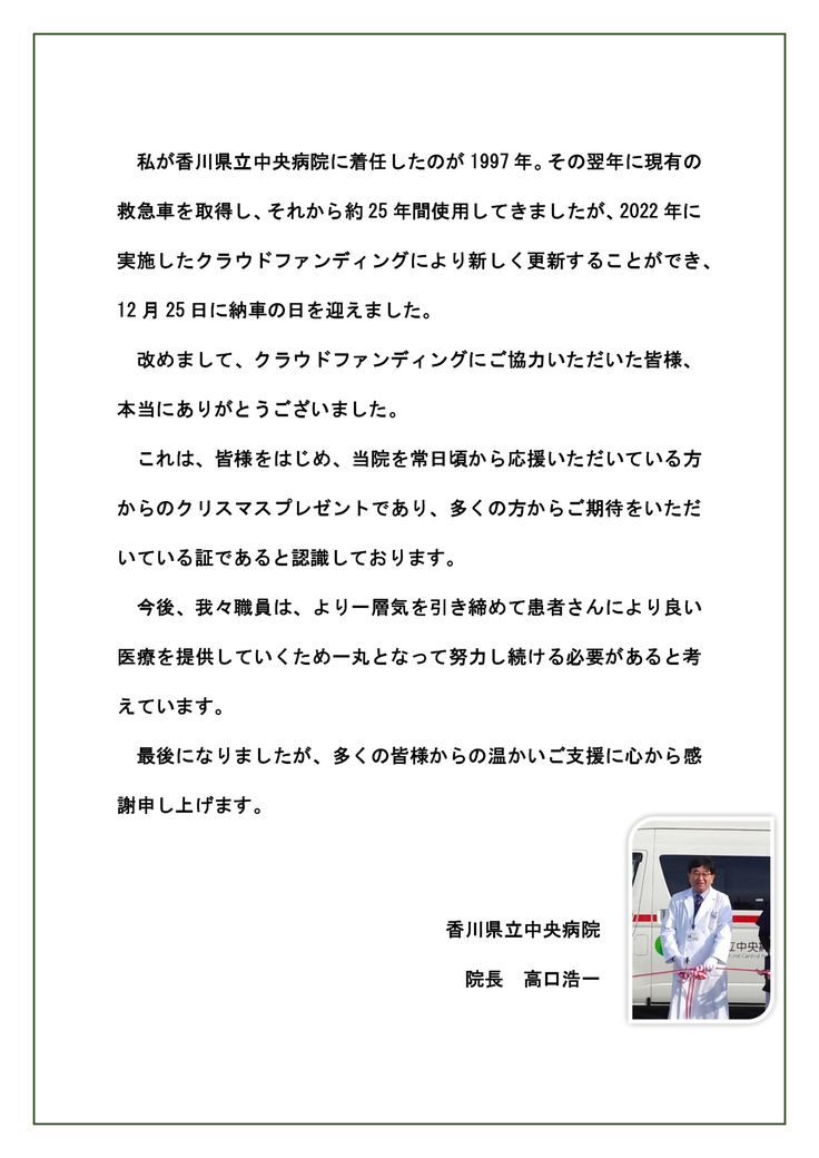 この度、クラウドファンディングにご協力いただいた皆様の温かいご支援により購入することができました救急車が12月25日に納車されましたことをご報告申し上げます。