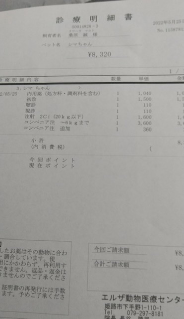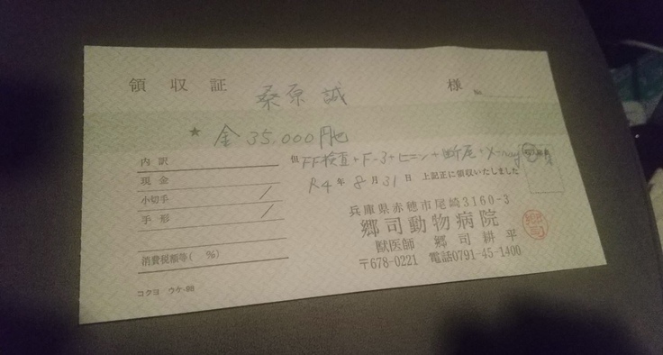 避妊手術、血液検査、ワクチン、ブロードライン、尻尾の怪我の治療をしました。医療費が35000円でした。ミーちゃん白血病、エイズのダブルキャリアです。