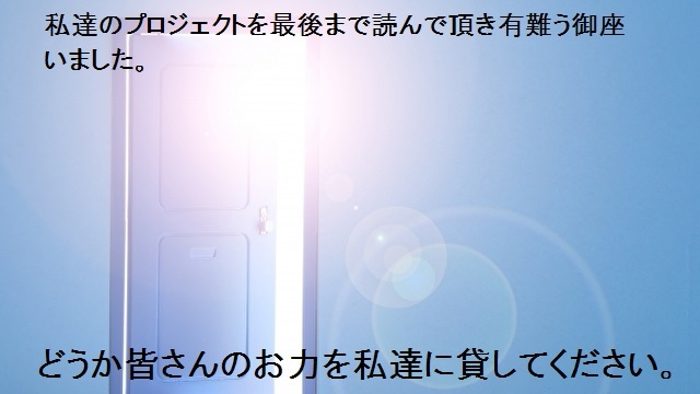 他人任せで本当に申し訳ないですが私達の最後の希望は今このプロジェクトを読まれている皆様です。皆様の支援によって私達だけではなく、私達に相談や依頼をして頂ける方も助ける事が出来ます。そして、もし皆様自身に何かお困りごとが有りましたら是非、私達「みんなの行政書士事務所」に御依頼ください。必ず出来る限りの事を行うとお約束いたします。