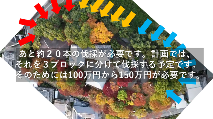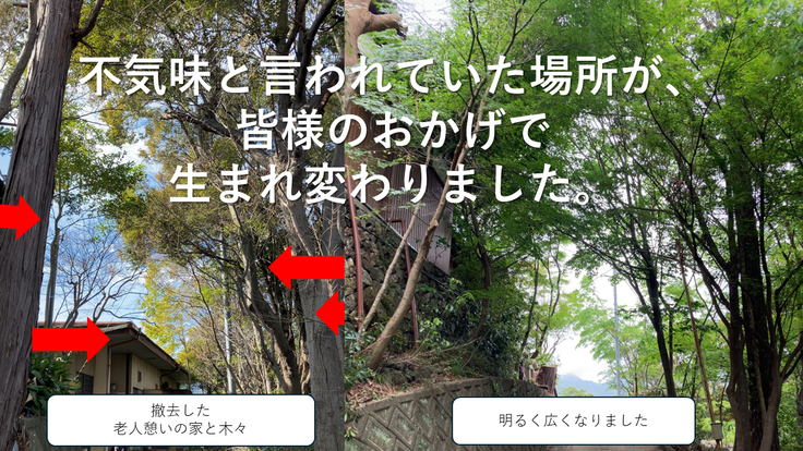 暗くて不気味と言われていた老人に憩いの家周辺が、皆様のおかげで生まれ変わりました。この2年間、花火でクラウドファンディングを始め、山の木の伐採や老人憩いの家の撤去等を行って参りました。空師の方や業者の方々と知り合うことができ、一歩ずつ前進しております。本堂・庫裏・明恵上人の卒塔婆等の安全が担保されました。しかし、山全体からすると、あと約20本の伐採が必要です。計画では、それを3ブロックに分けて伐採する予定です。そのためには100万円から150万円が必要です。