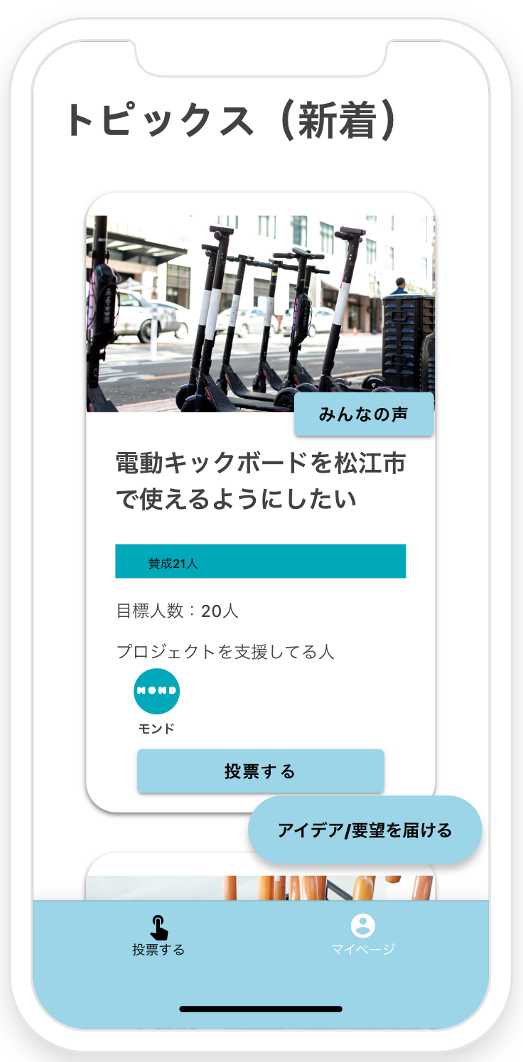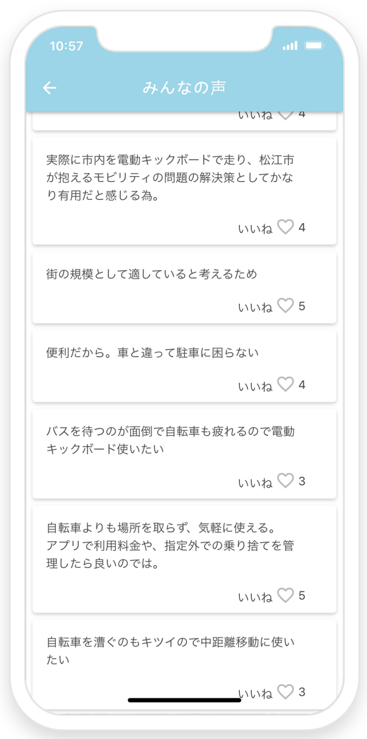 住民の要望やアイデアを集める意見集約プラットフォームMondに電動キックボードを利用したい方の声が集まったことがきっかけです。移動手段の少ない松江市において、中距離移動に最適な電動キックボードを求める声が多く集まってきました!