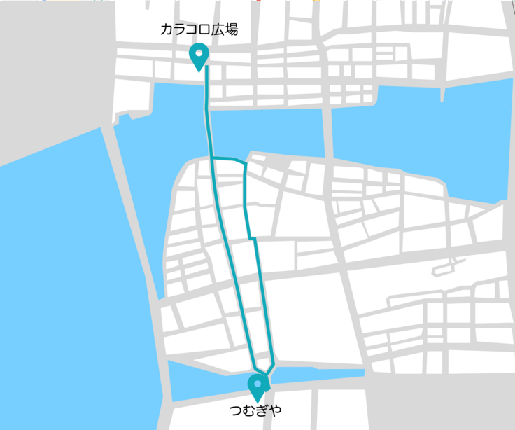 ルート カラコロ広場⇨つむぎやtatemachi2.0(京店商店街、松江大橋、白瀉本町、大橋通り、天神町商店街、天神橋通り)