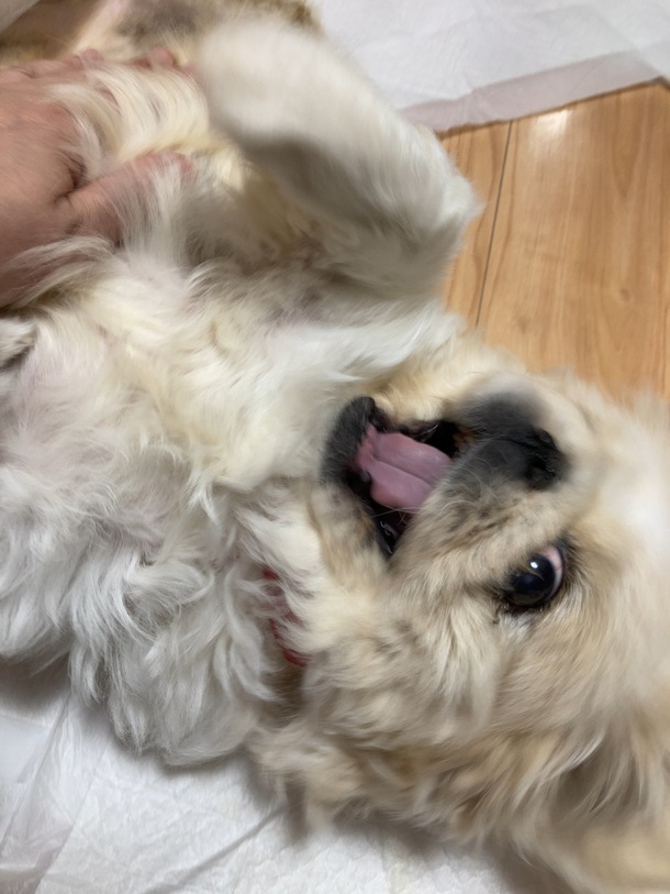 腰椎ヘルニアが発症してからは、横向きに寝る事がありませんでしたが、ローラー鍼が心地よかったのかゴロンと横になり、その後お腹を見せました。リハビリの成果が少しでも出ていてくれるのでしょうか…