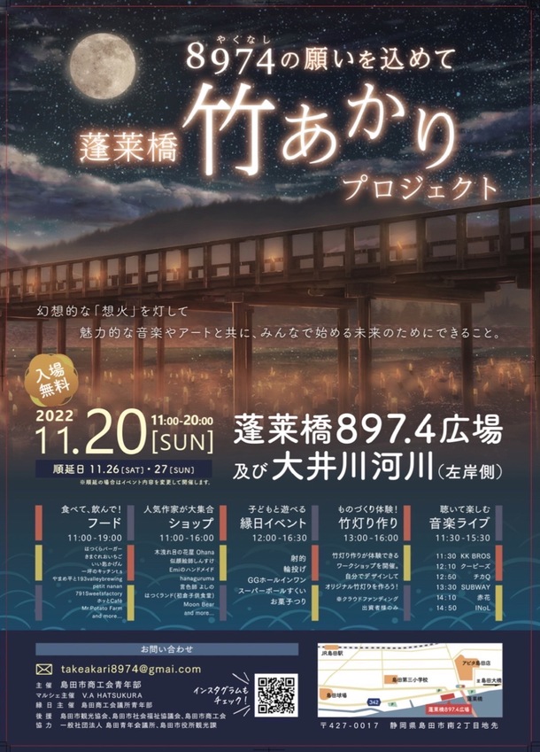 ⚫︎LEDライトで竹灯りを灯し光の川を創出することが出来ます。