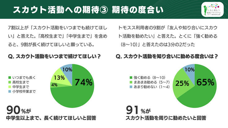 アンケート結果からは、経済的理由などで体験活動を諦めているひとり親家庭がボーイスカウトを選択していること、そして90%の方が子どもにボーイスカウト活動を長く続けてほしいと思っていることなどが見えてきました。
