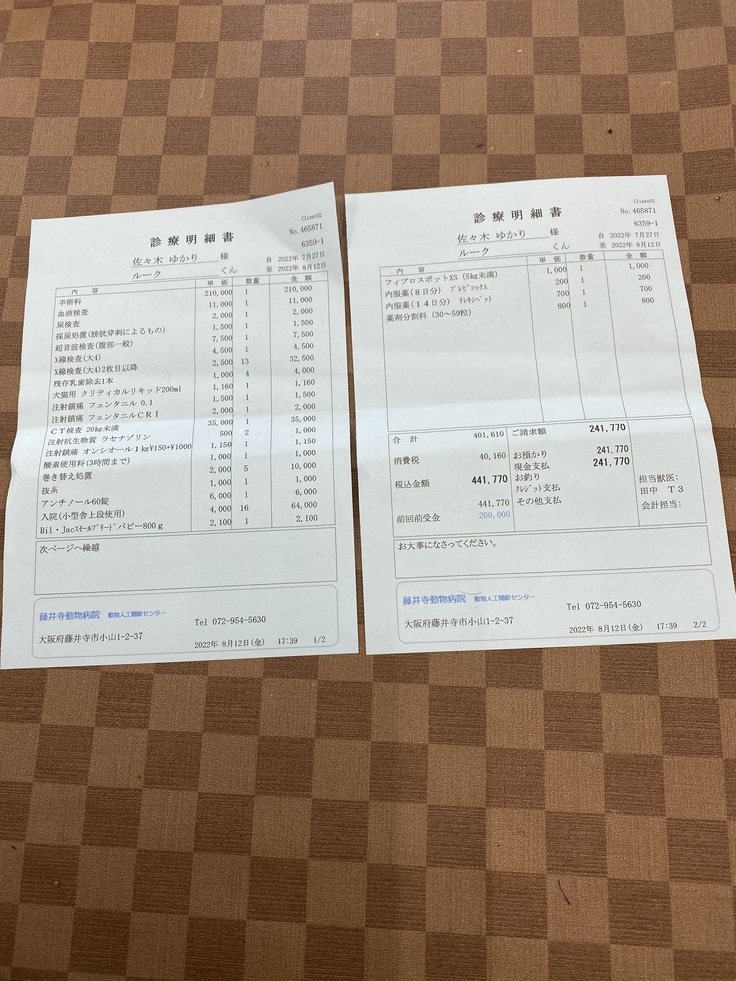 一度の手術で50万くらいかかります。1度目の手術、一か月後に2度目の手術で、更に50万となると先住犬も高齢で、医療費もかかり、自分の実父も、入退院の繰り返しで援助していましたが、8月6日に亡くなりました。ルークの手術費を捻出するのが不可能になりました。