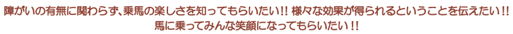 障がいのある方にとっての乗馬は、単に気晴らしや遊びとしてではなく、本来その方が持っている身体機能の回復や精神的な成長発達を促す効果を持っています。前後、左右、上下に動く馬の上でバランスを取ることによって、リハビリとしての効果や、馬に乗ったり触ったりすることで精神的なやすらぎを得たり自信にもつながっていきます。
