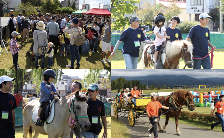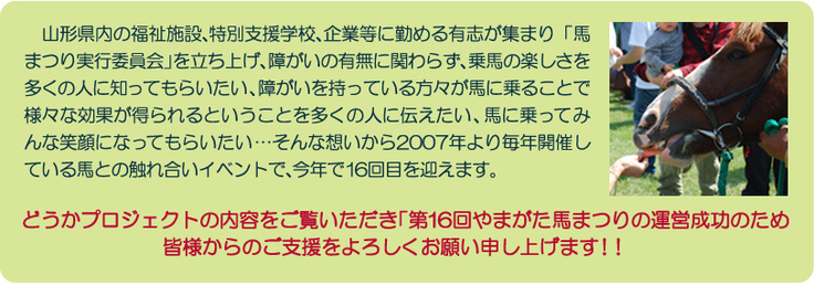 障がいの有無に関わらず、『乗馬の楽しさを多くの人に知ってもらいたい』『障がいを持っている方々が馬に乗ることで様々な効果が得られるんだよということを多くの人に伝えたい』『馬に乗ってみんな笑顔になってもらいたい』そんな思いから山形市内の福祉施設、特別支援学校、一般企業に勤める仲間たちに声をかけ有志を募り、「馬まつり実行委員会」を立ち上げ、2007年より始めた馬との触れ合いイベントです。