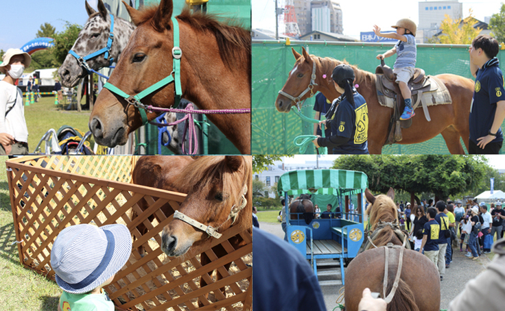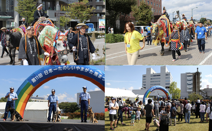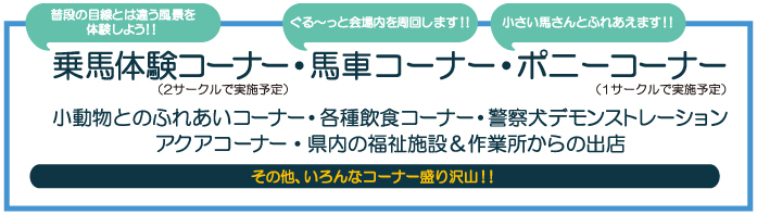 毎回レギュラーコーナーとして、普段の目線とは違う風景を体験できる「乗馬体験コーナー」、ぐる~っと会場内を周回する「馬車コーナー」、小さいお馬さんとふれあえる「ポニーコーナー」、間近でふれあえる「馬待機所でのふれあい」などのコーナーをはじめ、うさぎやモルモットなどの小動物とふれあえる「小動物とのふれあいコーナー」、「警察犬デモンストレーション」、水の生き物にふれあえる「アクアコーナー」、「各種飲食コーナー」「県内の福祉施設&作業所からの出店」「うまのすけマルシェ」等々、内容盛りだくさんでおこなっております。 また、特別企画として過去に、岩手県より「チャグチャグ馬コ」をお呼びしまして山形駅裏の街中行進をおこなったり、またある年は、全国のご当地ゆるキャラのなかで「馬」に関係するキャラクターを集めての「ご当地馬ゆるキャラ大集合!!」などを実施いたしました。