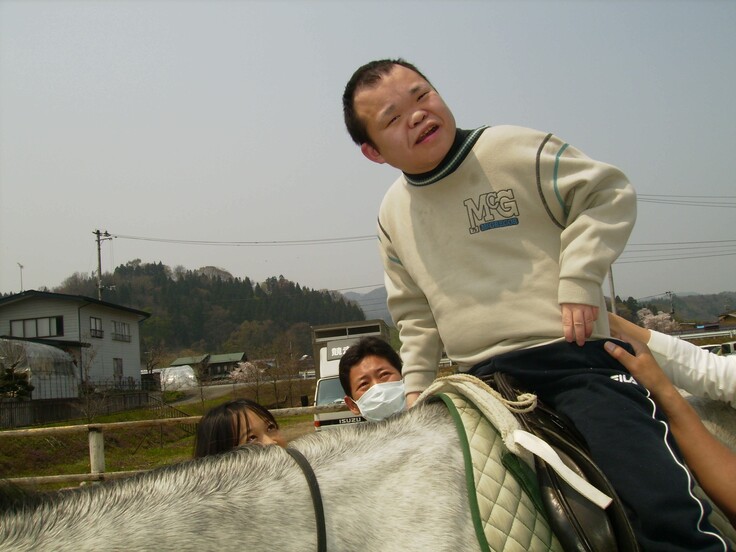 普段、生活の中ではあまり表情をかえることなく、笑うことの少なかった利用者さんが馬に乗った途端、満面の笑顔を見せてくれたり、脳性麻痺でまったく座位が取れず抱えられ乗っていた方が、2年の乗馬療法によって今では一人で馬に乗れるようになった・・・等々、様々な良い効果がみられることがあります。