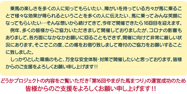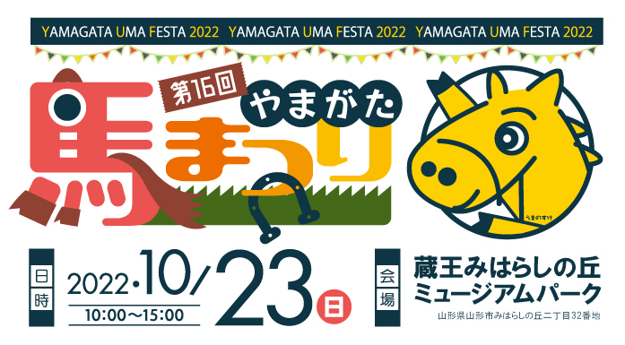 「やまがた馬まつり」は、障がいのある方に行っている乗馬療法という取り組みを、多くの方々に知っていただくことを目的に2006年より開催している乗馬イベントです。このイベントは障がいのあるなしにかかわらず、多くの方々が気軽に参加し、乗馬体験や馬との触れ合いを通して、馬の持つ魅力を充分に味わっていただきながら、「笑顔と感動」をたくさん感じていただくことを目的としております。今年はコロナ対策を万全に蔵王みはらしの丘ミュージアムパークにて開催いたします。実行委員会一同、第16回「日本一たのしい やまがた馬まつり」に全力を挙げて取り組んで参る所存でございますので何卒、よろしくお願い申し上げますm(__)m