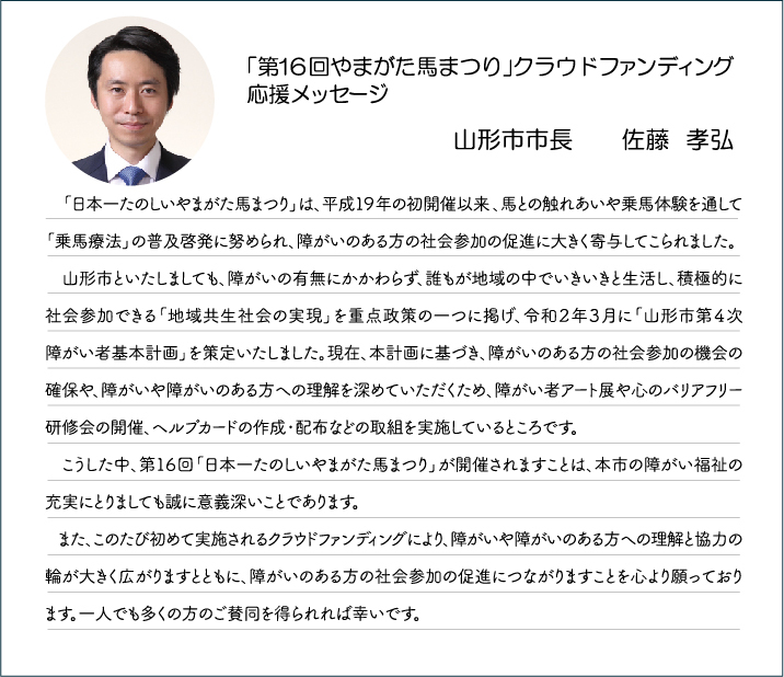 このプロジェクトをご覧いただき本当にありがとうございます!!やまがた馬まつり実行委員長の高橋千秋と申します。