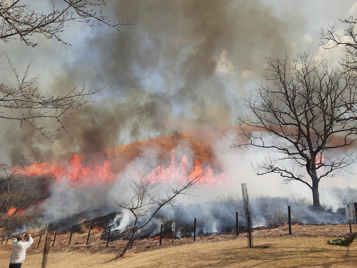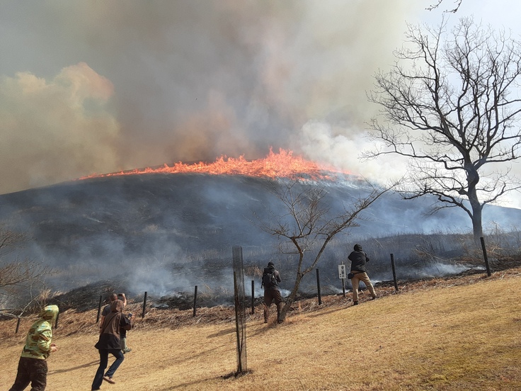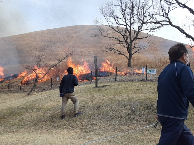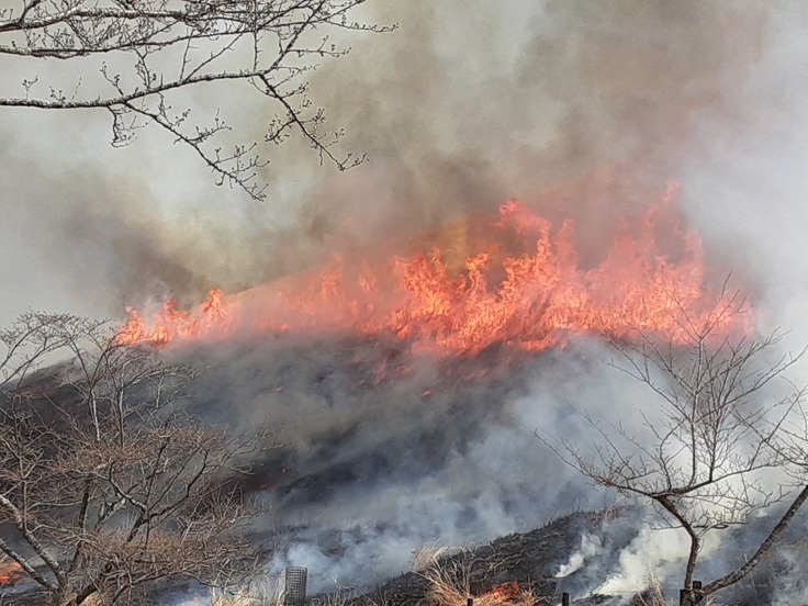 野焼きの最初のスタートから順次燃え上がりまもなく黒の衣装替えした山の神まで順次見ていただこう。