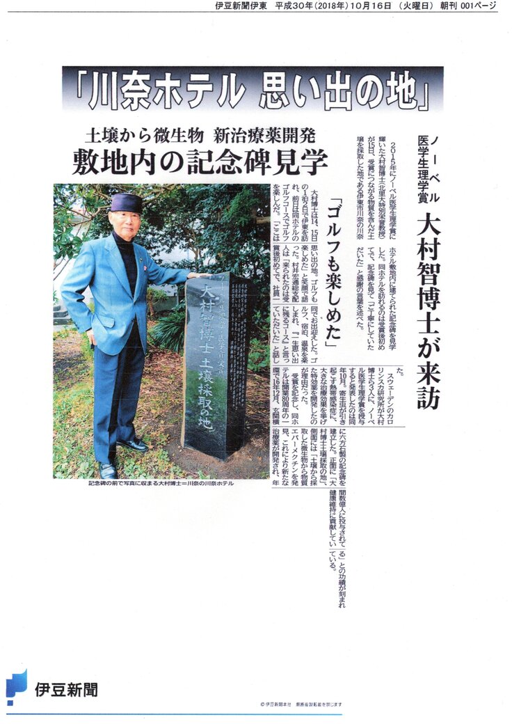昭和50年(1975)、大村博士(当時40歳、北里研究所入所10年目)は微生物採集をかねて伊東の川奈ゴルフ場に足を踏み入れた。そこでたまたま採集した土壌のなかから発見した微生物のおかげでノーベル賞受賞という栄誉がもたらされた。それは北里研究所創設者であり伊東に宏大な別荘を建てた恩師・北里柴三郎の導きであったかもしれない。そして大村先生は柴三郎が1901年ノーベル賞を逃がしたうっぷんを114年ぶりに晴らして、恩師のご恩にこたえられたのである。