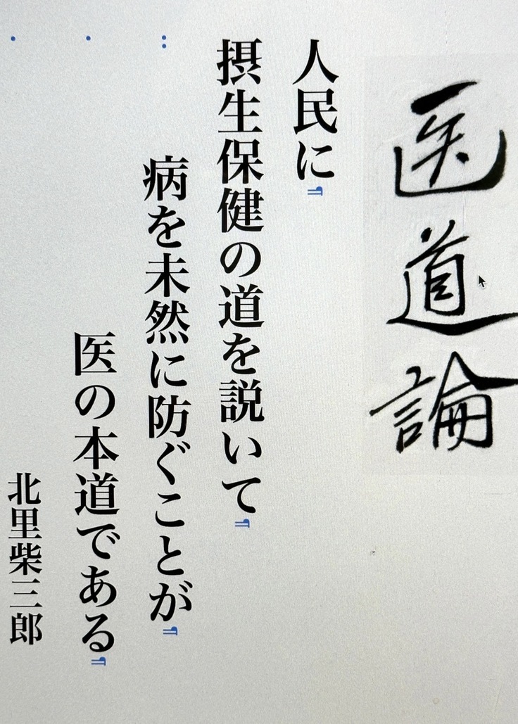 「医の真の在り方は、大衆に健康を保たせ安心して職に就かせて国を豊かに強く発展させる事にある。人が養生法を知らないと身体を健康に保てず、健康でないと生活に満たせる訳がない。人民に健康法を説いて身体の大切さを知らせ、性命を病気から守り、病気を未然に防ぐのが医道の基本である。」(『医道論』北里柴三郎 述、明治11年)