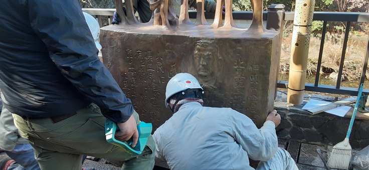 工事を担当した石井石材のスタッフ4人、デザインを設計し顕彰碑を製作した彫刻家重岡先生の立ち合いのもと丁寧に丁寧に行われた。