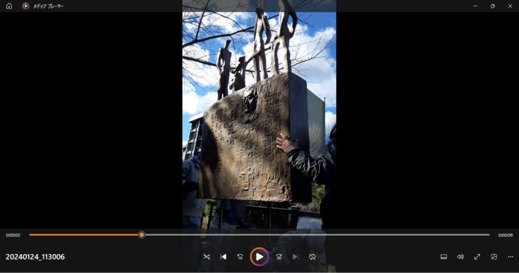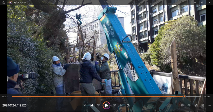 顕彰碑を目的地に搬入するのに桜の枝が邪魔をするという想定外の事態もあったが、臨機応変な対応がなされて無事据付予定地に到着。台座工事も無事終えていよいよクレーンで据え付け開始。重さ350Kg,巾1・2M,高さ2.2M,奥行き60Cmが中空の高さから次第に地面の台座に降ろされ、二本の真鍮の心棒をうまく嵌め込んで合体。