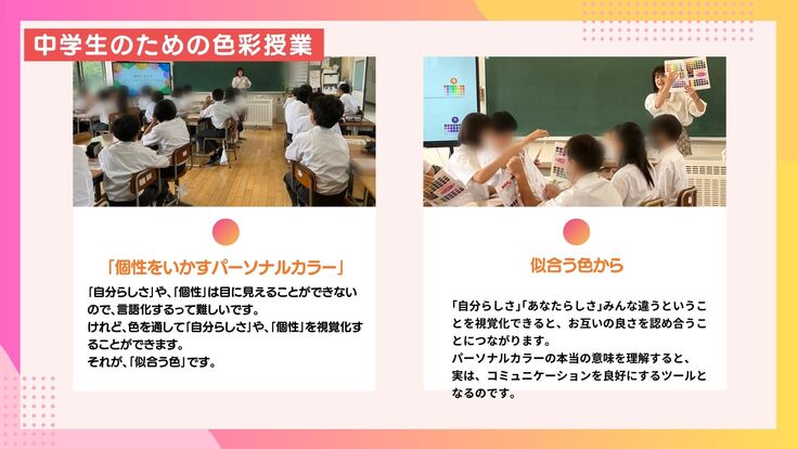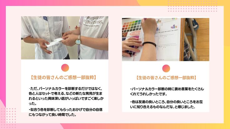 「個性をいかすパーソナルカラー」のお話から「自分らしさって何」をクラスメートと一緒に考る時間になりました。