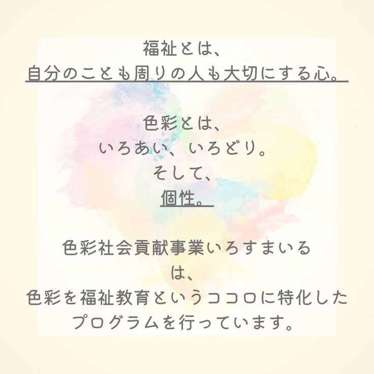 NPO法人色彩社会貢献事業では、色彩を福祉教育というココロに特化したプログラムを行っています。