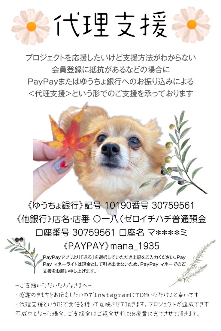 つきましては、大変恐れ多いのですが今回外科治療にかかる144万6千6百円と手数料を合わせた金額を目標額として設定させていただきました。(治療額については担当の先生に見積書を出してもらい確認済みですが、追加される可能性もあるとのことで、その分に関しては自己負担する予定です。)