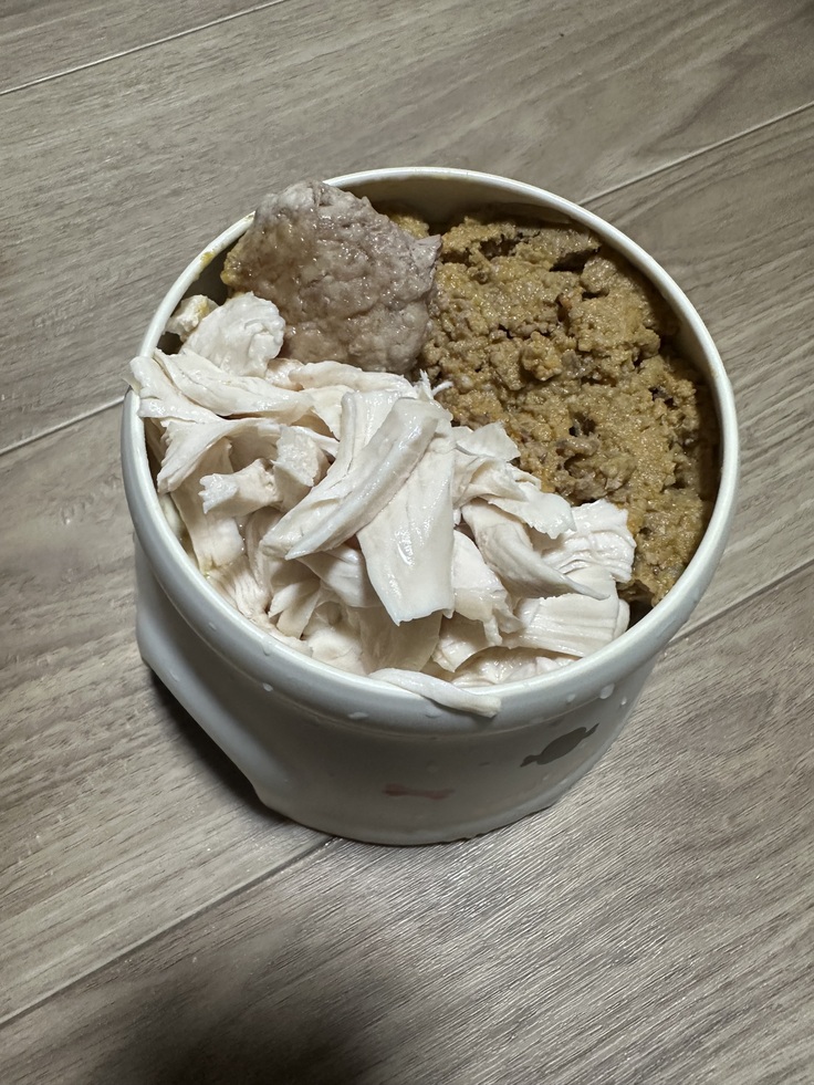 元々偏食もあり普段からゆでささみとエリンギ。サバ、ニンジン、ナス、鶏胸肉、レバー、小松菜、を混ぜてペースト状にした手作りごはんを主に食べていましたが今日は全く食べません。