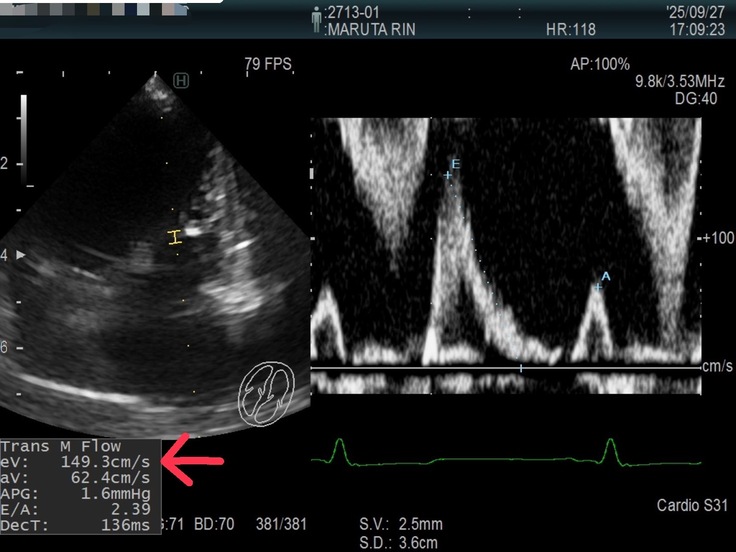 エコーの結果左心房圧が上昇しており肺水腫のリスクが高まっているみたいです。E波と言われるものが先週の126㎝から149.3㎝に上昇していました。(画像の矢印の数値)