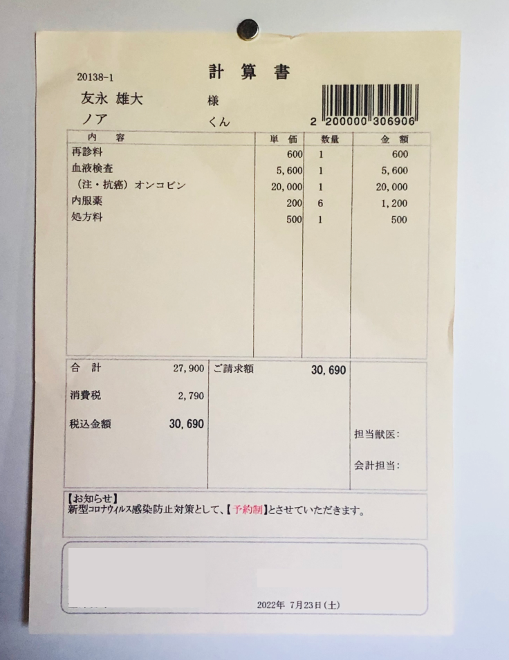 抗がん剤:ノアが通う病院では1週間ごとに異なる薬を4種類投与し、休薬期間を挟み、同じサイクルを4回繰り返す方針です。9時に預け15時にお迎えに行きます。