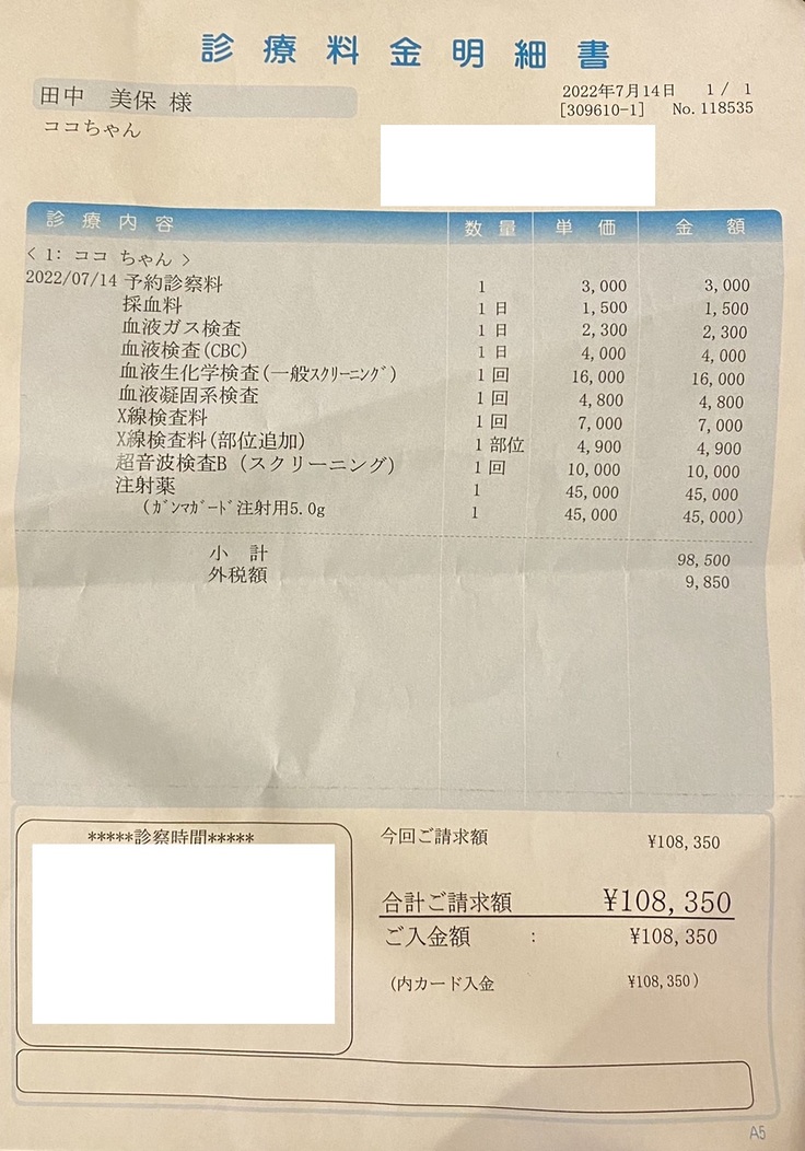 「ここまで、これからの治療予定」 ・注射薬(ガンマガード)等の初期治療 11万 ・入院期間:10~14日 ・ICU、血液検査 1日当たり5万円 ・輸血 1日当たり8万円(数回予定) ・注射薬(ガンマガード)継続 1回5万円 など。