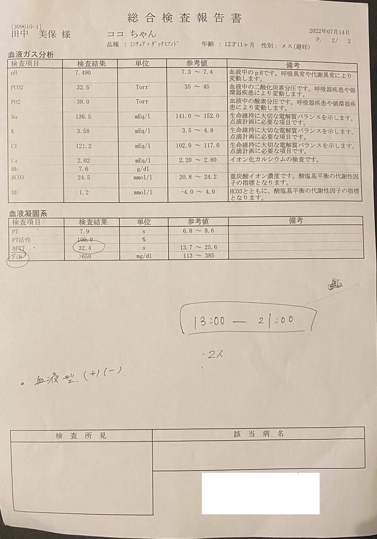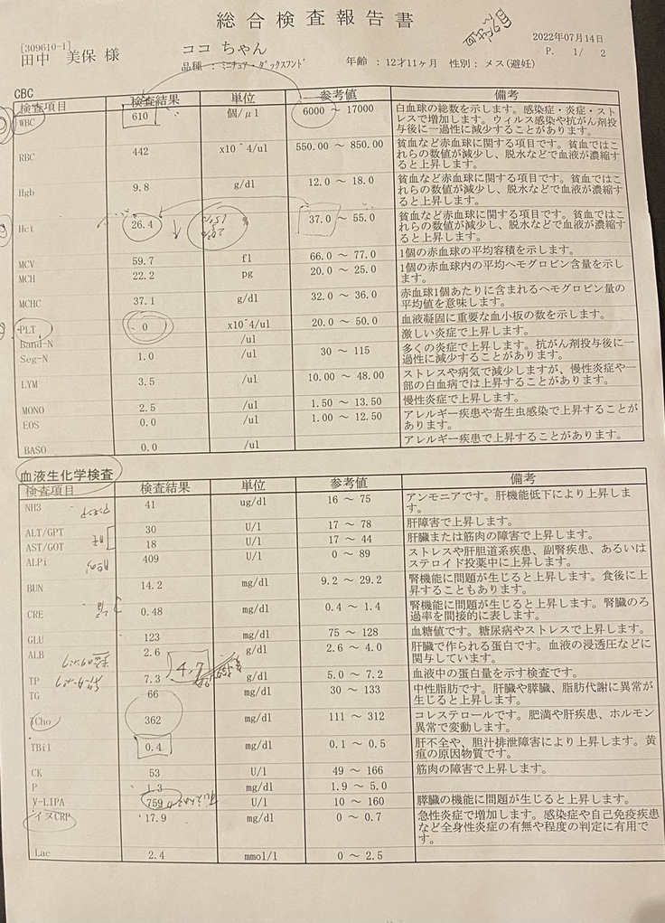白血球、ヘマトクリット、血小板の数値が異常であり、24時間看護での治療が必要になりました。特に血小板の数値がゼロで、万一体内で出血で大きな出血が起こったら危ない状態です。