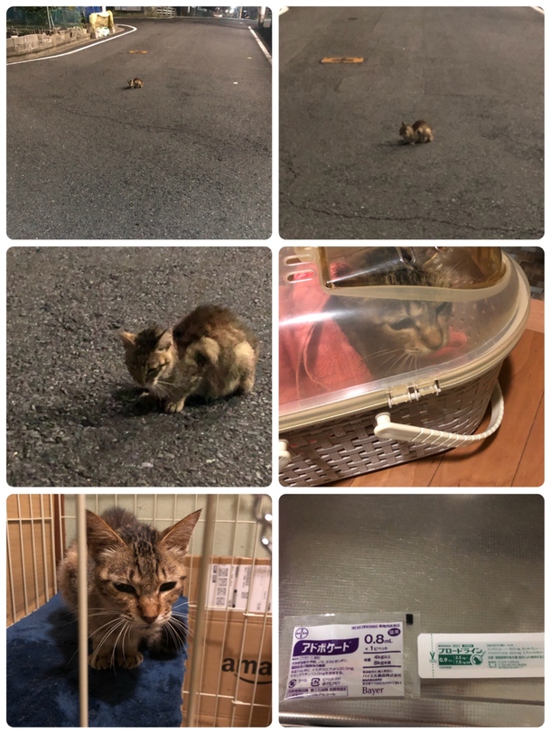 ん?⁇以前はシェルター玄関先に来てフードとミルク食べてましたがなんだか歩くのもキツそうです。車が来たら逃げるとは思うのですが万一の事があると悔いが残るのでシェルターにて保護しました。これでシェルター周辺の猫4匹と仔猫5匹全て保護しました。この子はそのままにしてると冬が越せないかもしれないし😫周辺はこの子で最後かな⁇と思いながら急いでタオルに包んで連れて帰りました。夜な夜なケージを組み立てブロードラインを付けて落ちついてます。しばらくケージ生活ですが健康診断,ワクチンを済ませたらにゃーずの仲間入りです。