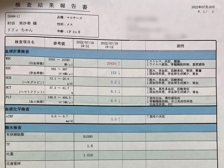 すると、「問題ない程度ですが熱が少しあるのとお腹が少し張ってます」と言われ、血液検査をして頂きました。結果は全体的にあまり良くない結果が出ました。