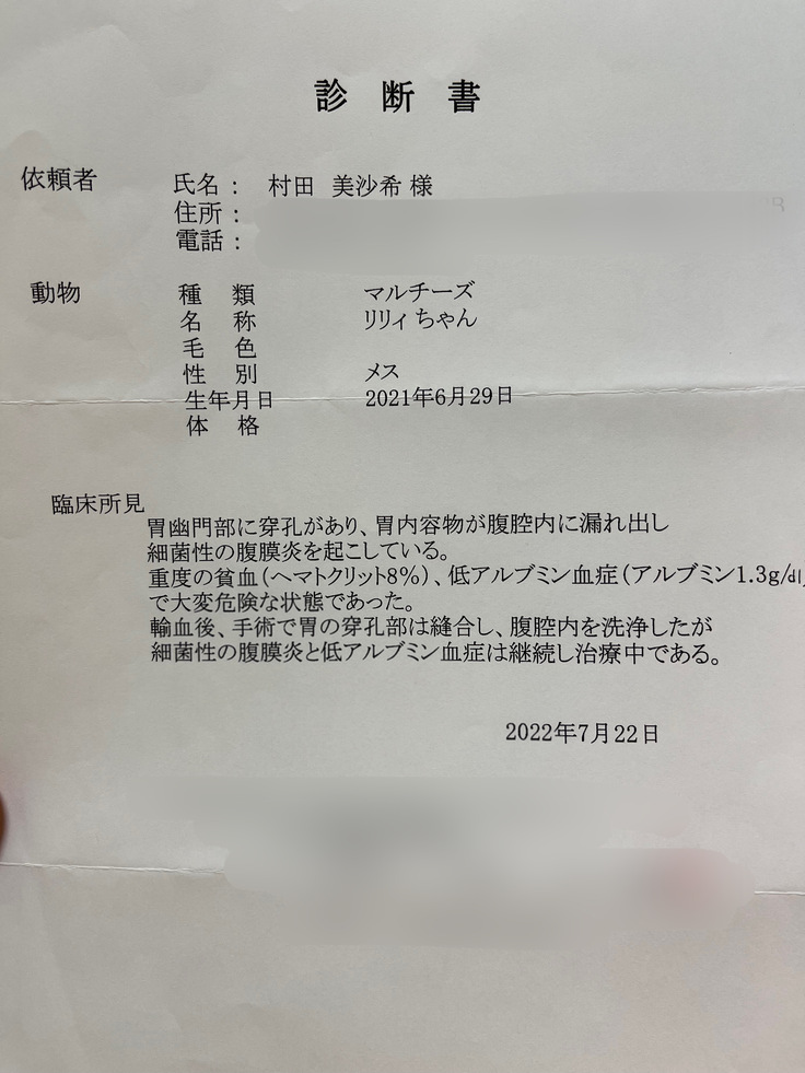 「胃と腸の境目の開いたり閉じたりする幽門という部分に穴が開いていて、検査結果上手術をするのも危険な状態なので血液が合うかを調べて、合えば一晩輸血して、明日の血液検査結果が少し良くなっていれば明日手術しましょう。ただ、幽門は扉みたいなものなので閉じきれないので、手術後にうんちが出ない場合、更に大掛かりな手術をする事になります」と言われました。それでもこの状態で置いておく事も出来ないので先に輸血費6万円の半分の3万円をお渡しして、手術のお願いをしました。血液が合うかを調べてもらっている間ただただ祈りました。