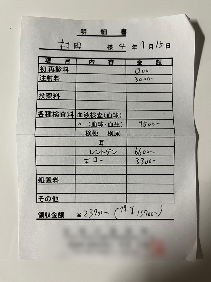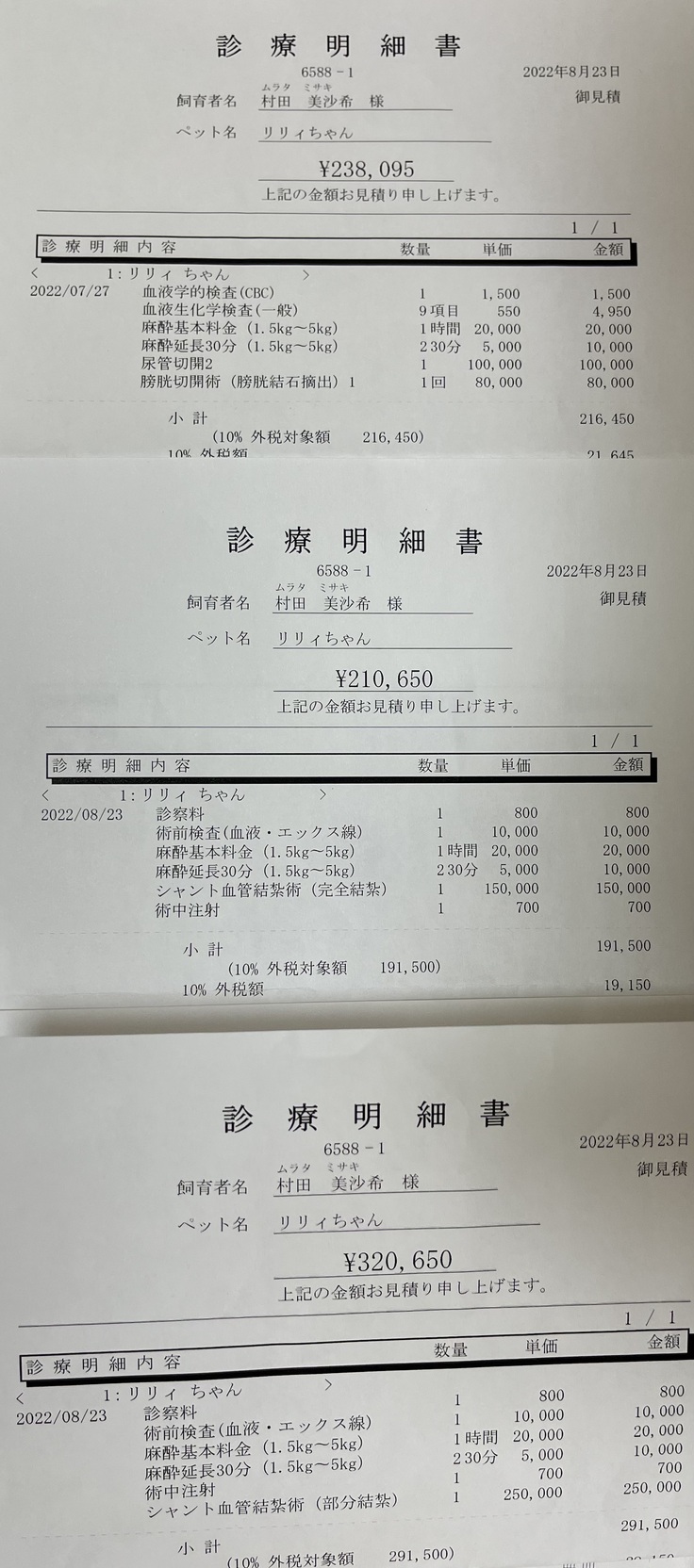手術が門脈シャント2回と結石1回の計3回です。手術は2回(1回につき最大10万円)までしか利きません。その為手術費用は膀胱結石と尿管結石で10万円利いて13万8095円、シャント血管(部分結紮)は10万円利いて22万650円、シャント血管完全結紮は3回目の手術になる為回数上限が超える為、保険は利かず21万650円掛かります。
