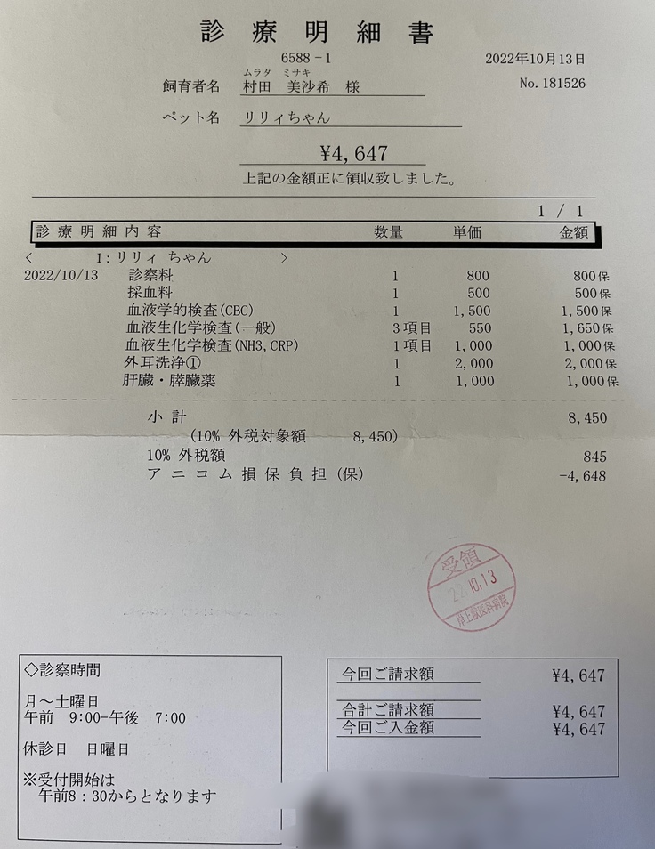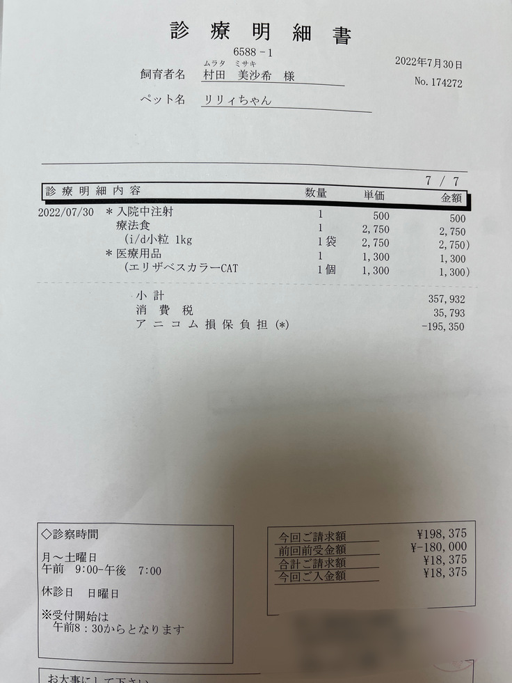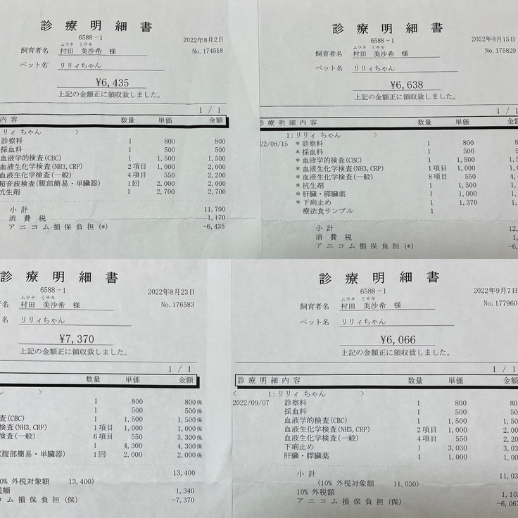 保険はアニコム損保の50%に加入しています。9月に保険の更新があった為、腹膜炎で使った保険(入院、通院、手術の回数)がリセットされていて、入院は20日、通院は17~18日、手術は2回に戻っていました。