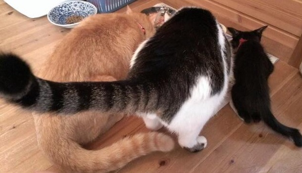 当たり前のように先住猫と肩を並べてご飯を食べ